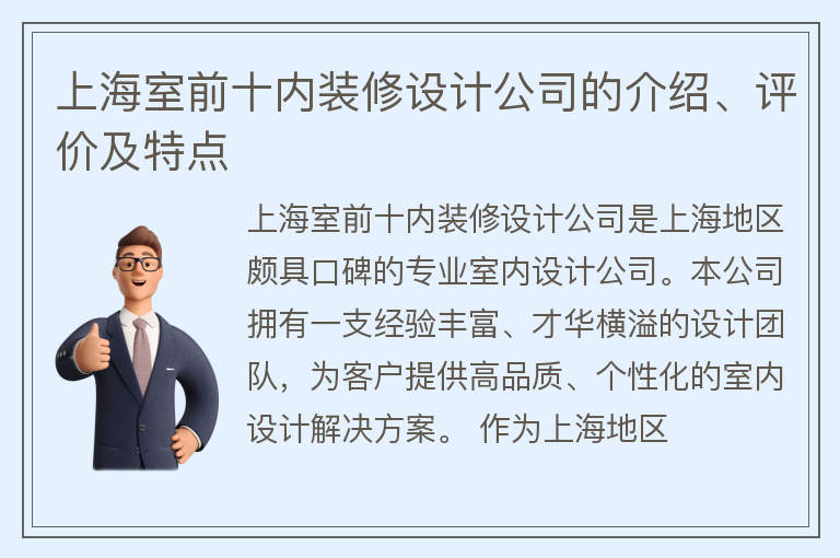上海室前十內裝修設計公司是上海地區頗具口碑的專業室內設計公司。本公司擁有一支經驗豐富、才華橫溢的設計團隊,為客戶提供高品質、個性化的室內設計解決方案。