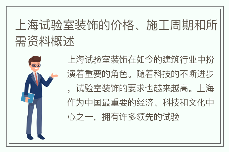 在建設試驗室時,施工周期是一個關鍵問題。對于上海試驗室裝飾的施工周期有多長,可能是許多人比較關心的問題。本文將詳細闡述上海試驗室裝飾的施工周期,并探討影響施工周期的因素。