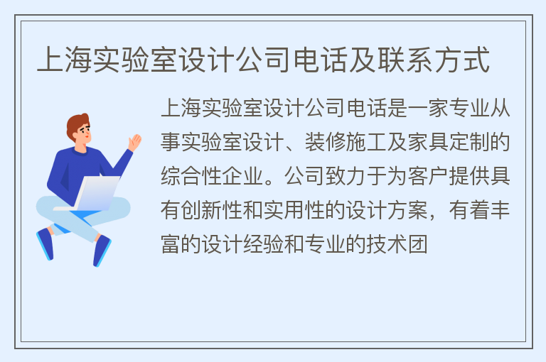 實驗室是現代科學研究的重要場所,實驗室設計的好壞,直接影響到研究的效率和質量,而實驗室設計公司可以提供專業的設計方案和服務。作為一個重要的細分領域,上海有很多實驗室設計公司,那么大家關心的問題來了,上海實驗室設計公司電話是多少呢?接下來我們就為大家介紹上海幾家實驗室設計公司以及他們的電話聯系方式。