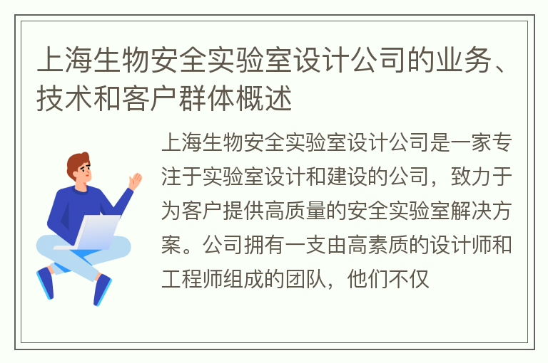 隨著生物工程技術的日益發展,越來越多的實驗室涉及到生物安全領域,需要設計專業的實驗室。而上海生物安全實驗室設計公司作為一家專業從事實驗室設計的企業,受到過越來越多的關注。那么,該公司的客戶群體究竟是哪些呢?