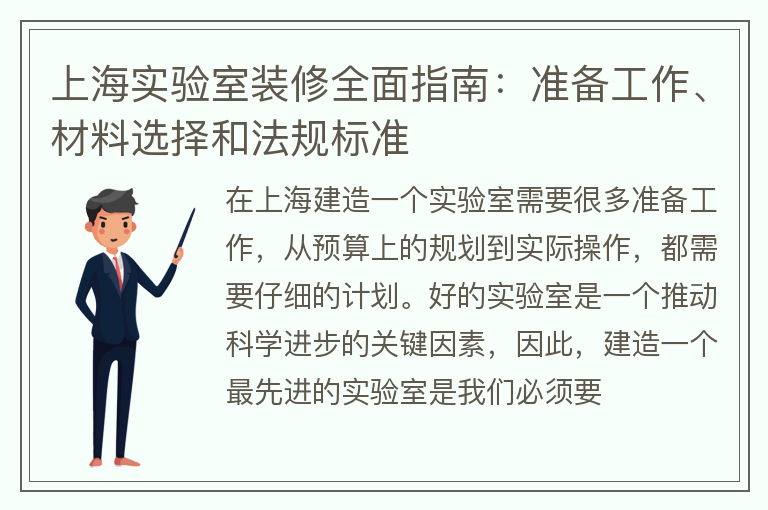 在上海建造一個實驗室需要很多準備工作,從預算上的規劃到實際操作,都需要仔細的計劃。好的實驗室是一個推動科學進步的關鍵因素,因此,建造一個最先進的實驗室是我們必須要做的事情。一個能滿足各種需要的實驗室需要針對各項需求進行考慮,滿足設計標準和規范,從而將實驗室建造成分析、探測、診斷和治療各種病癥的最佳場所。