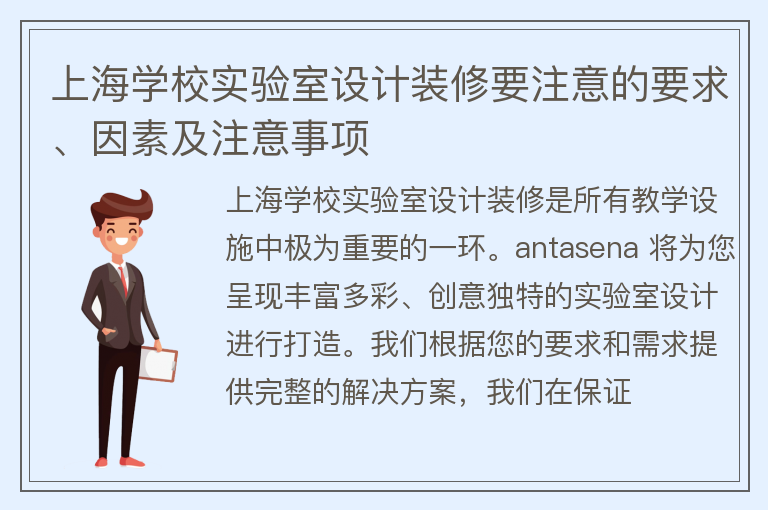 上海學校實驗室設計裝修是所有教學設施中極為重要的一環。antasena 將為您呈現豐富多彩、創意獨特的實驗室設計進行打造。我們根據您的要求和需求提供完整的解決方案,我們在保證設計專業性和實用性完美統一的基礎上,運用最新科技和綠色理念,打造一個舒適實用、健康環保的實驗室。