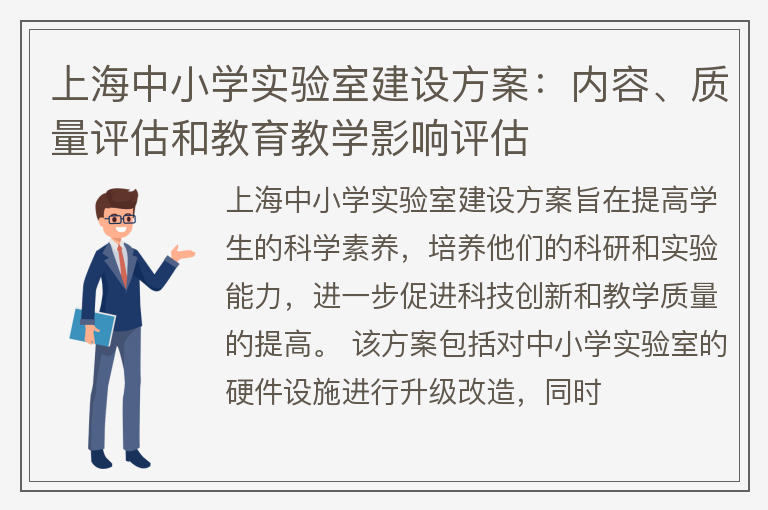 上海中小學實驗室建設方案旨在提高學生的科學素養(yǎng),培養(yǎng)他們的科研和實驗能力,進一步促進科技創(chuàng)新和教學質量的提高。